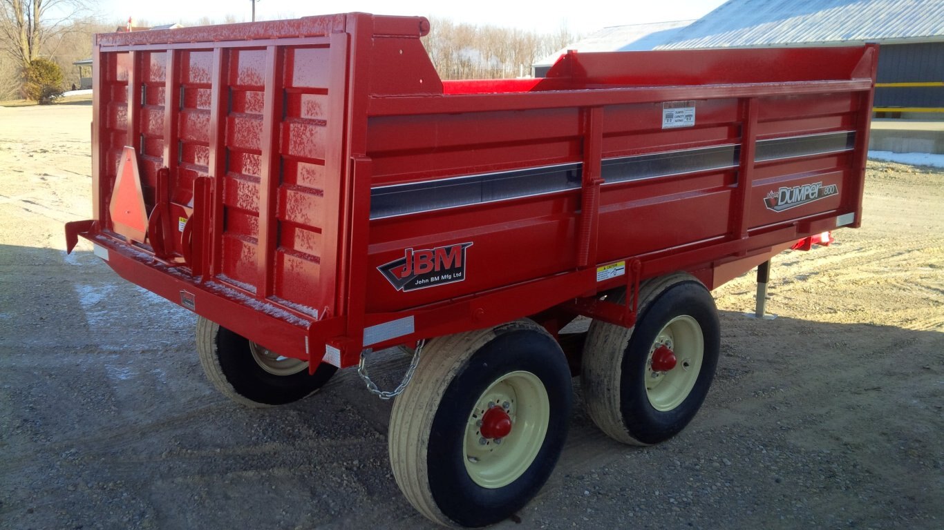 2025 Mighty Dumper from JBM. 8-ton, 6 x 10 with grain door, self opening tailgate, swivel hitch, 2' removable sides, 11L-15 x 8 tandem