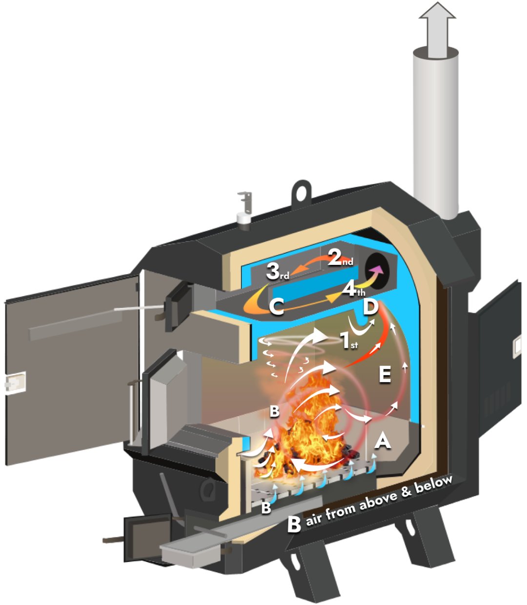 STAGE 3: Charcoal burns at temperatures in excess of 1100 degrees F. Latent heat also helps in the re-ignition of the fire at the start of the next burn cycle. It also helps to dissipate moisture that is a result of the combustion process. The dry base boiler design gives a very hot burn. The water jacket sits above the brick line so it isn’t up against the fire, taking away the heat prematurely. This eliminates ash line corrosion and the fuel is completely burnt, resulting in considerably less ash.