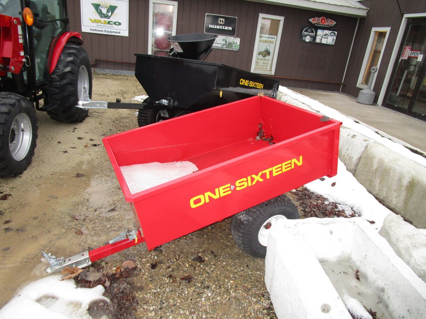 NEVER USED, NEW DUMP TRAILER (SLIGHTLY WEATHERED), SINGLE AXLE. 34” WIDE x 50” LONG x 13” HIGH, REMOVABLE TAILGATE, 6 PLY TUBELESS.